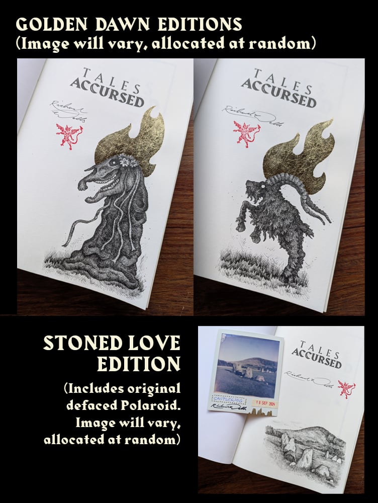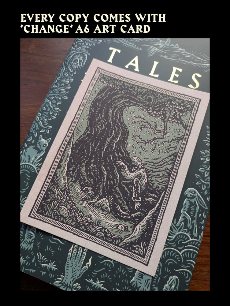Every copy includes an A6 art card of the illustration for the story 'Change' by Arthur Machen. This was a planned additional tale to be included in the paperback edition of Tales Accursed, but the publisher went under before this could go into production.